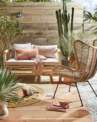 Los muebles de fibras naturales son una buena elección tanto en interiores como exteriores. Acompañados de lámparas, alfombras, cestos o maceteros de los mismos materiales naturales, son piezas que no te pueden faltar. Pero es verdad que dependiendo del tamaño quizás nos interesa apostar por otro tipo de muebles que sean menos voluminosos y que al acabar la temporada podamos guardar.